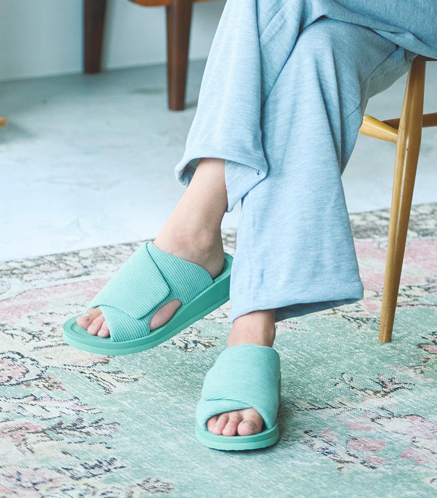 定番のキルティングタイプは、ソールをアッパーと同色にすることで、トープの軽快さがアップしました。ステッチが入っていることで形が崩れにくく、来客用に揃えておくのにもぴったりです。